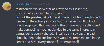 You better believe we're big on browser games and mobile apps! Like Neopets, Flight Rising, Dappervolk, Tattered World, Goatlings, Lio/Wolvden, Pokémon GO and Cookie Run, just to name a few!But that's not all we're about. We've also got channels for general chatting, art, music, game development, life advice, Animal Crossing: New Horizons and so much more!Our community has hosted events such as movie/game nights and yearly Secret Santa exchanges in the past. We're currently in the process of recruiting coordinators to amp up the frequency of these events and new ones in the coming year and would love to have more members along for the ride!For Dappervolk and Cookie Run: Kingdom players, we even have group guilds! Assuming we're not past our current member capacity, Discord server members can gain instant membership if they so desire!Still unsure if this Discord server is your type? We've got a healthy selection of testimonials to peruse, if you're in the market for them!
