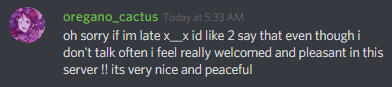 Lighthearted ranting or complaining is usually fine, but try to refrain from discussing any serious negativity outside of the vent channels. In the case of bringing up any kind of community drama, we'd also like there to be no name dropping. If there needs to be name dropping for the sake of awareness, please take it to direct messages.